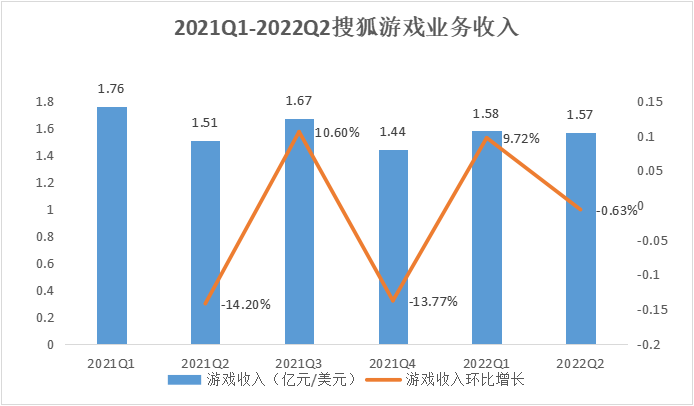 本季度,搜狐游戏业务实现收入1.57亿元,较去年同期同比微增3.97%,较上季度的1.58亿元收入环比有0.63%的略微下调。