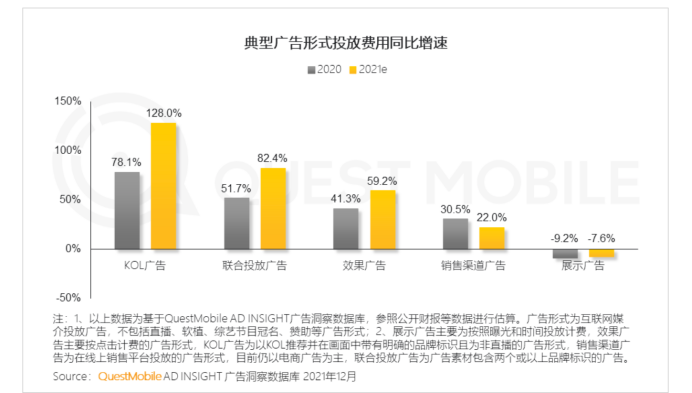根据QuestMobile《2021中国移动互联网年度大报告》,相较于传统展示广告在2021年的同比负增长,KOL(达人)广告形式在近年来大获认可,在2020年和2021年同比增长分别为78.1%和128%。
