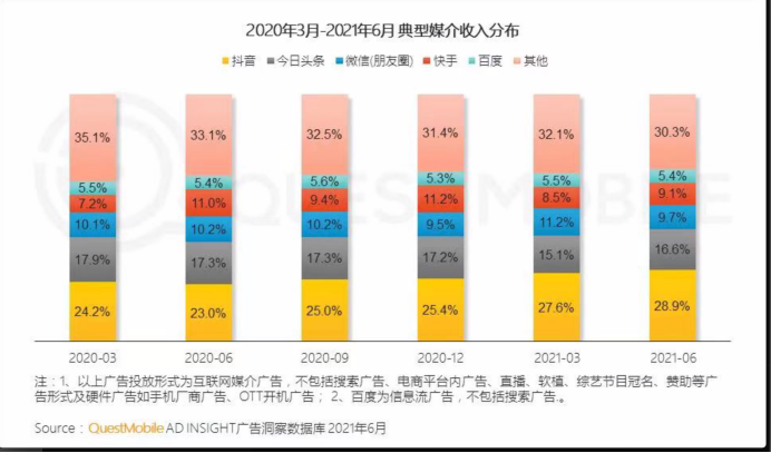 从QuestMobile公布的2020年3月-2021年6月典型媒介收入分布中可以看出,字节系的头条、抖音,腾讯系的微信,百度以及快手将展示类、社交类、短视频类以及咨询类的广告几乎全部占领,总收入占比超过总典型媒介收入的70%。而搜狐则要与剩下的媒介争取20%-30%的市场份额,这其中还包括势头强劲、用户活跃度较高的种草、网文类等新型App。