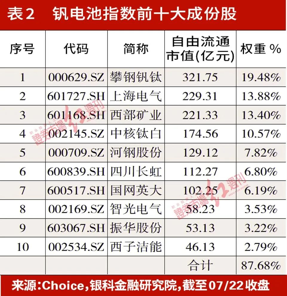 钒电池指数成份股共计16只,前十大成分股按自由流动市值合计占比接近90%,集中度较高,主要涉及产业链中价值量占比较高的电解液、电池系统、变流器、系统集成等环节。