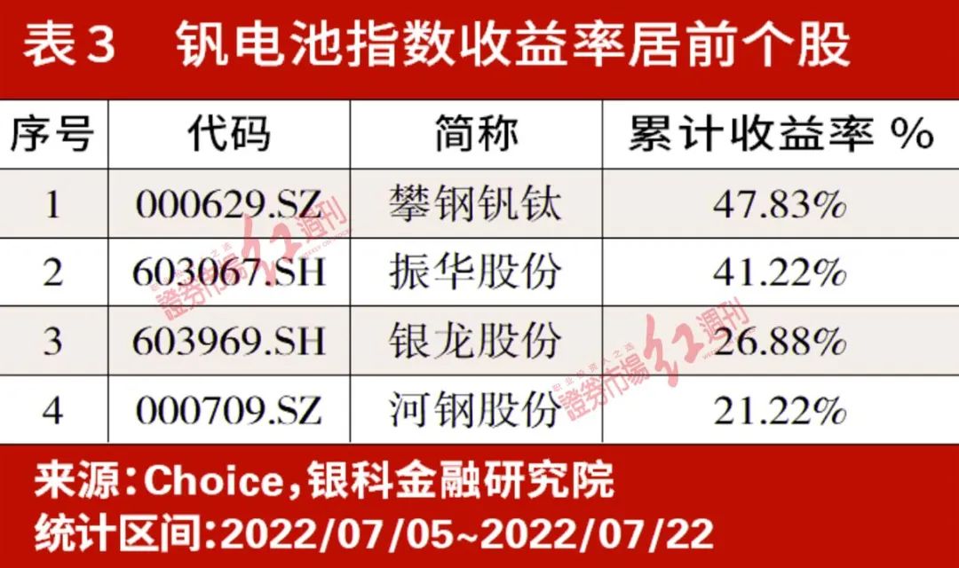 个股收益率方面,在2022/07/05~2022/07/22期间内,有4只个股的累计收益率超过20%,主要涉及钒液流电池的上游原材料环节。