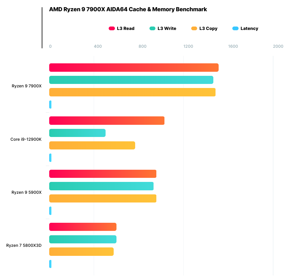 此外,根据曝光的信息来看,虽然三缓与上一代相同,但是二缓大幅度增加让其有着极高的缓存带宽,目前曝光出来7900X的带宽高达1450GB/s,对比5900X提升50%以上。凭借三缓性能的暴涨,7000系的游戏性能表现应该会相当出色,有网友预计其不会属于13代酷睿处理器。