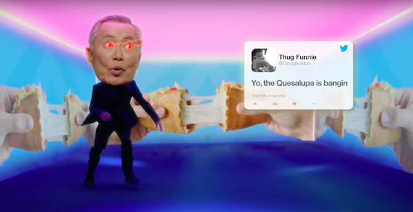 美国著名演员为一款墨西哥食品塔可钟(Taco Bell Quesalupa)做的广告也是全程高能,魔性笑声、激光眼、还说着一口混合了西班牙语的英文,最后还变成天使上天了。