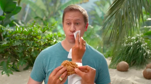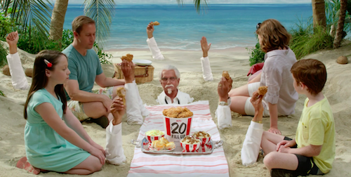 KFC广告中代表创始人的白发老头也变身成了诡异的爬行物,在沙滩上变出若干只胳膊,还能举着炸鸡腿喂你……(真的不会吓到小朋友吗?)