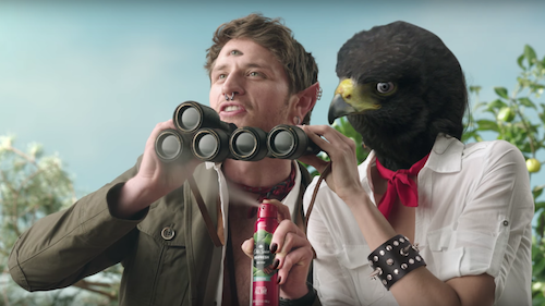 Old Spice是个典型的例子,这个宝洁旗下的男士护理品牌有着75年的历史,2010年开始于波兰W+K合作推出不少无厘头的搞笑“病毒广告”,而它最近的新广告更是超现实到无法理解:男主角拥有三只眼、精灵耳、戴鼻环,与长着“鹰头”的女子共同一个带有五个镜头的望远镜。