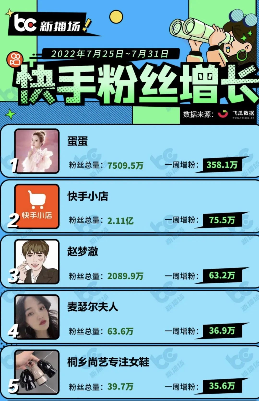 7月25日-7月31日这一周,分居快手涨粉榜TOP1的“蛋蛋”与TOP3的“赵梦澈”皆是“辛巴门徒”,而在最新一周拿下TOP15的“猫妹妹”、TOP17的“五五”也是同样。