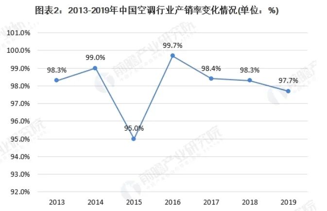 而整个空调行业也不太景气,已进入下行周期。根据国家统计局公布的数据显示,2013-2019年我国空调产量和销量逐年增长,但2017年以来,我国空调销量开始低于产量,行业产销率逐年下滑,2019年我国空调产量为21866万台,超出销量500万台,产销率为97.9%,行业存在产能过剩的问题。