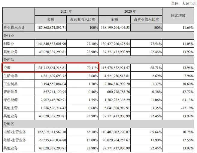 可即便如此,格力的空调营收也在2021年被美的反超,2021年美的全年营收3434亿元,空调业务贡献了1418亿元,而格力引以为傲的空调业务仅营收1317亿元,相差101亿元。
