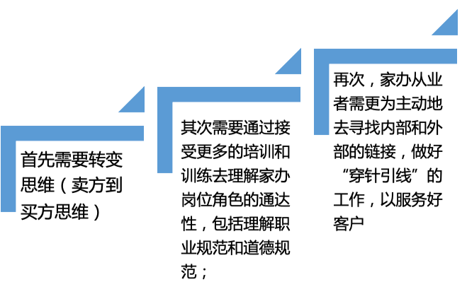 总的来说,家办的核心成员是“全能型”的,不但能够处理资产方面的事务,还需处理家族治理各个维度的事宜,不同于一般金融机构理财师或财富顾问的卖方思维。要成为合格的家办从业者,首先需要转变思维(卖方到买方思维);其次需要通过接受更多的培训和训练去理解家办岗位角色的通达性,包括理解职业规范和道德规范;再次,家办从业者需更为主动地去寻找内部和外部的链接,做好“穿针引线”的工作,以服务好客户。