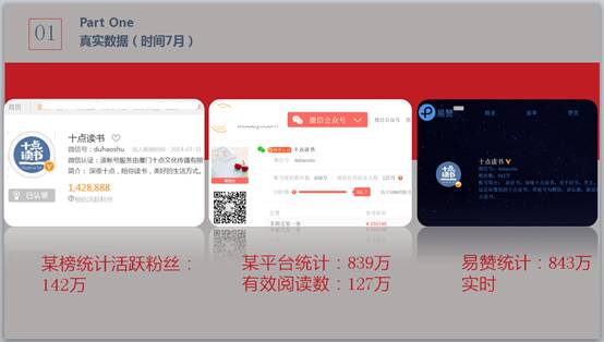 这是拿“十点读书”举例,同一个账号,不同平台对数据的更新是不同的,目前新榜以预估为主,预估活跃粉丝142万,易赞则是实时更新数据,以7月某天为例是843万粉丝。