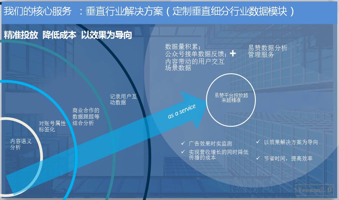 垂直行业解决方案:通过对各个账号进行内容分析之后,易赞不会简单的按照汽车行业、金融行业这样传统账号分类方式,而是针对性定制垂直细分行业数据模块,大大提升效果。易赞在有一些细分领域的投放已经实现了1:2甚至1:3的投入产出比。