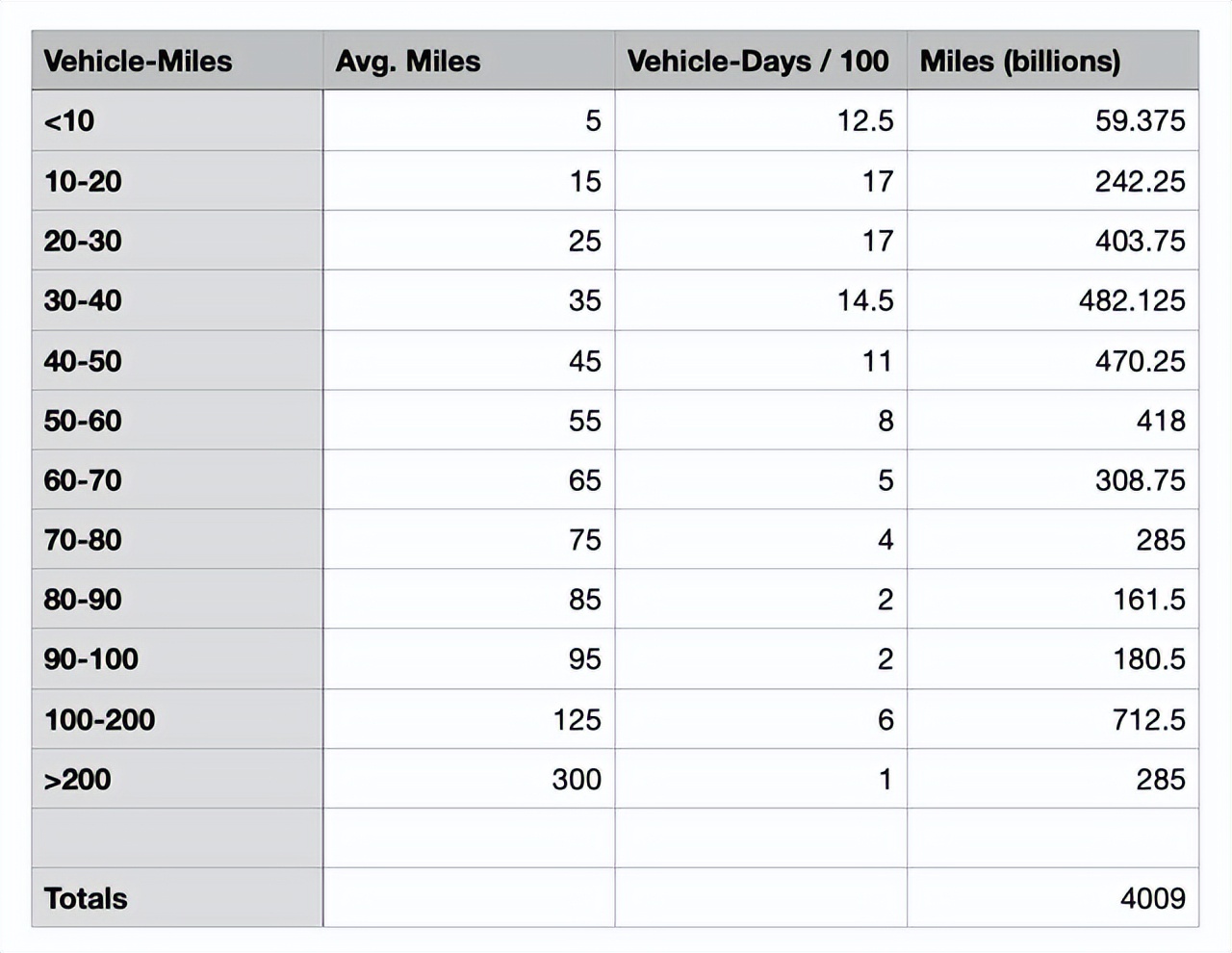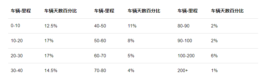 美国车队在任何给定时间的里程分布情况相当有趣。虽然每辆车的平均行驶里程是每辆车每天40英里,但分布并不均衡,61%的车辆行驶里程低于这一标准。我已将相关数字复制在下表中。