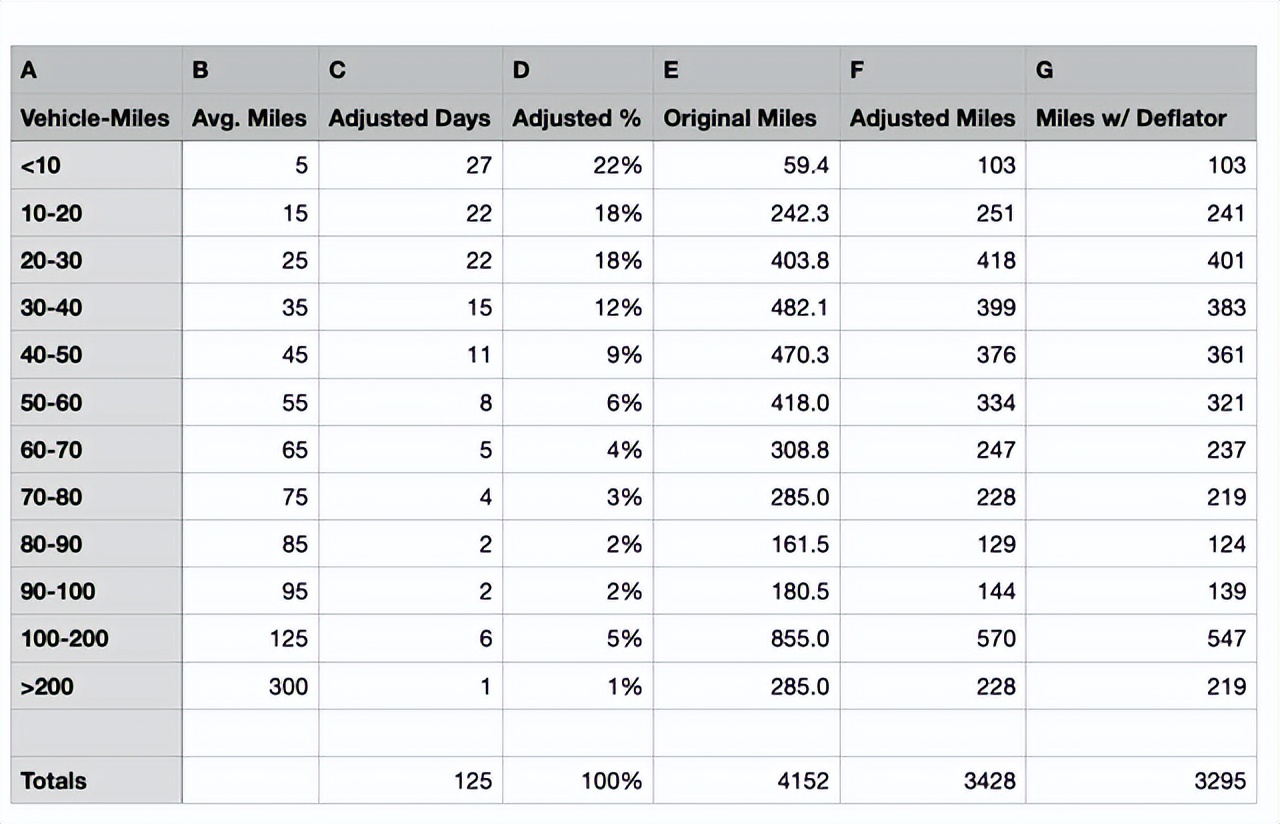 然后,我将这些数字插入一个表格,计算出如果数据准确,它将在全国大约2.6 亿辆汽车中创造多少车辆行驶里程。我将分段权重表示为每 100 天的天数,而不是百分比,这当然是一回事。