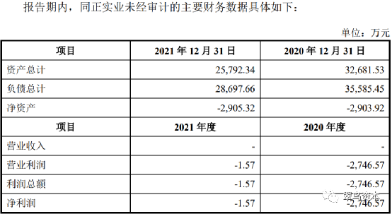 该公司未经审计的主要财务数据显示,2021年的净利润亏损1.57万元,近两年净资产均为负值。