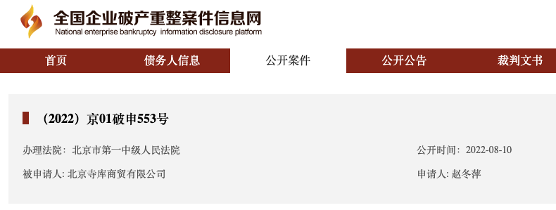 全国企业破产重整案件信息网显示,8月10日,北京寺库商贸有限公司新增一则破产审查案件,申请人为赵冬萍,办理法院为北京市第一中级人民法院。今年1月,该公司曾被申请破产审查,后申请人撤回申请。