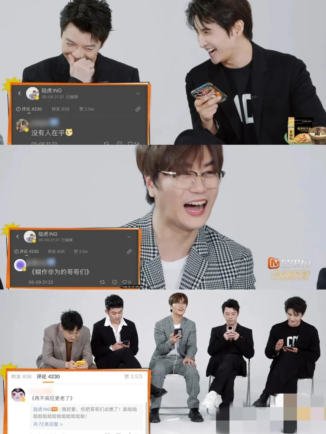不过,如果简单只俘获这批观众,《快乐再出发》或许并不能得到这样好的观众反馈,关键在于他们也能得到当下许多年轻人的喜爱。一方面,男团哥哥们身扛“音乐人”身份,业务能力十分抗打,能在节目中随时开唱、创作(《活该》《我哭了我又哭了》是节目中的梗、也是他们创作的即兴歌曲),让年轻观众对他们的才华十分认可。