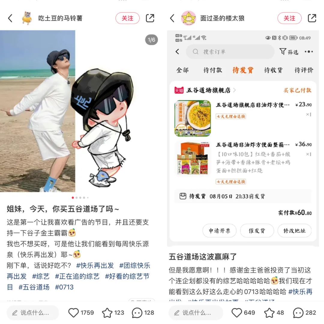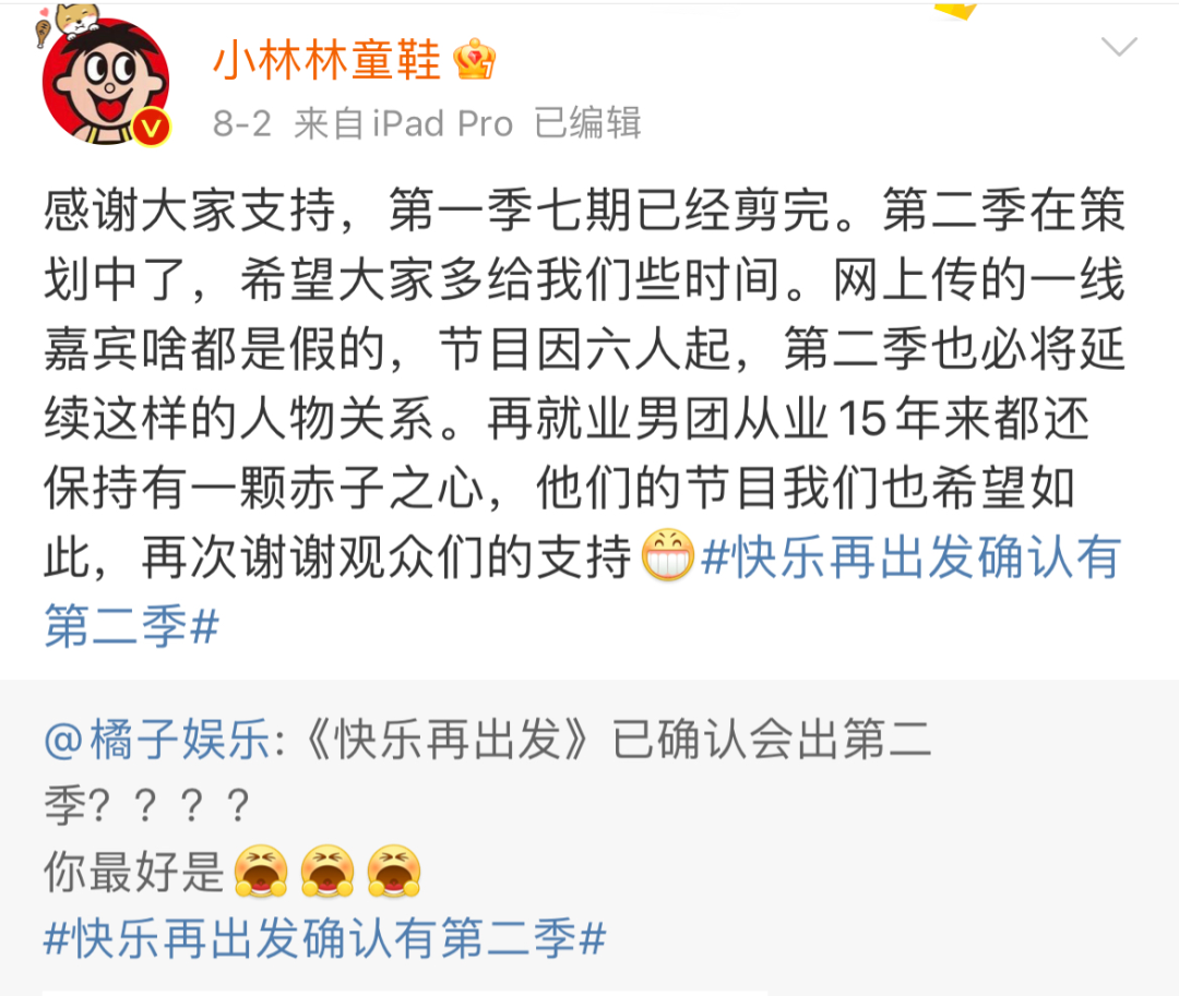 紧接着,粉丝们开始在线呼喊节目组“不够看”,《欢迎来到蘑菇屋》制作团队大千影业则开始接手制作他们的团综《快乐再出发》,并直播为节目在线招商,最终获得了五谷道场和RIO两家广告赞助商。
