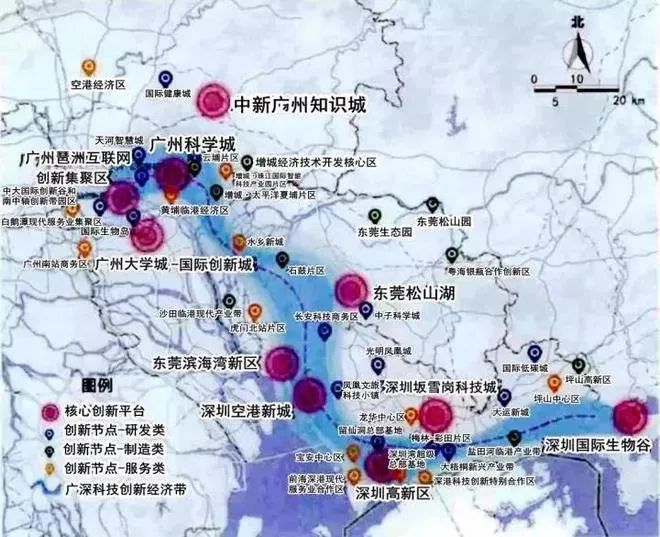在2017年发布的《广深科技走廊规划纲要》中,广东省政府明确提出10大科技创新极点,其中,广州大学城-国际创新城、科学城、琶洲互联网创新集聚区、中新知识城赫然在列。