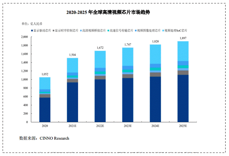 CINNO Research统计,中国与全球在高清视频芯片领域保持同步增长,且贡献接近一半的市场。2020 年全球规模为1052亿元人民币,中国为467亿元。2021 年全球高清视频芯片市场规模大幅增长至 1504 亿元。