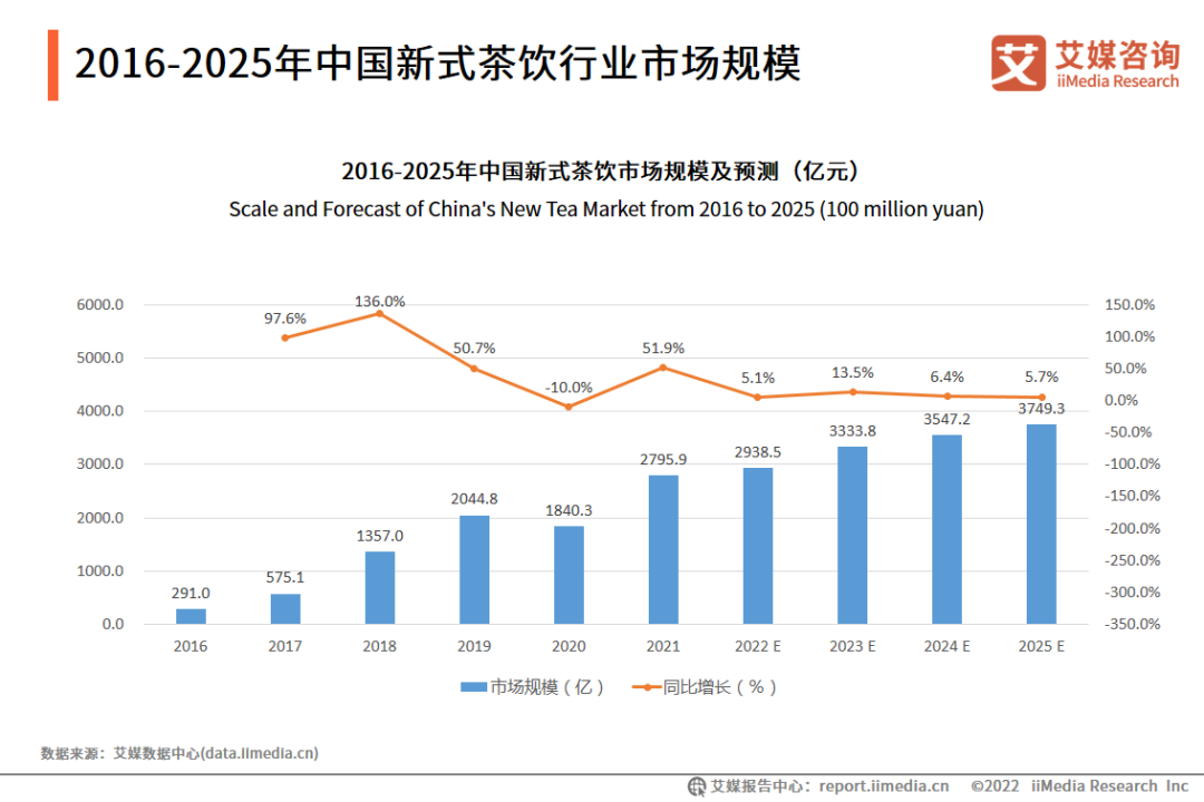根据《中国餐饮品类与品牌发展报告》数据显示,未来2到3年内,新式茶饮增速阶段性放缓,调整为10%-15%。另艾媒数据显示,2016—2021年,新式茶饮行业市场规模翻了近10倍,但未来五年的增速均值仅为6%。