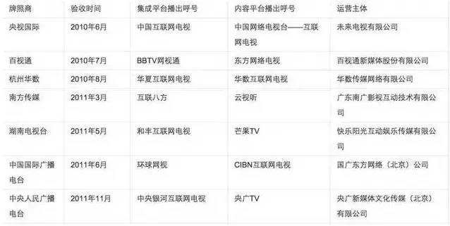 作为网络资源接入电视的入口,广电总局对于其拥有资质进行了严格的把控,必须持照经营,目前发出的7张牌照,分属央视国际、杭州华数、上海文广百视通、南方传媒、湖南电视台、中国国际广播电台以及中央人民广播电台7家广电系统。