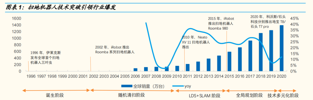 纵观海内外扫地机人发展:从2010年,规划式清扫-摄像头定位路线,到2016年,石头科技带来了自研的 LDS 激光雷达 + SLAM 算法,让扫地机器人变得好用……技术上的突破为扫地机器人进入千家万户提供了强基础。