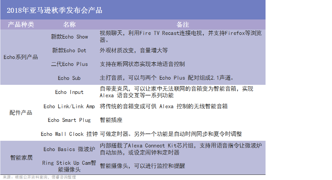 有钱的亚马逊两手都抓:一方面,“买买买”,先后收购了Blink(典型产品:以电池供电的网络摄像头和智能门铃)、Ring(典型产品:配备摄像头的智能Wi-Fi门铃)等一系列智能硬件厂商;另一方面,亲自下场打造硬件单品,如2018年10月的发布会上,亚马逊一口气推出了11件智能硬件,包括4款Echo系列产品、5款配件产品以及2款智能家居产品。