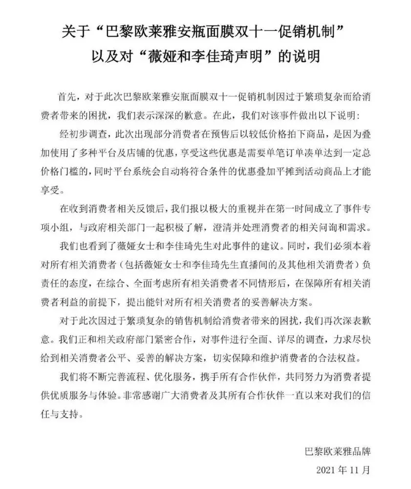 (欧莱雅的致歉信,透露着平台优惠机制过于复杂,配合平台就无法配合薇娅。)