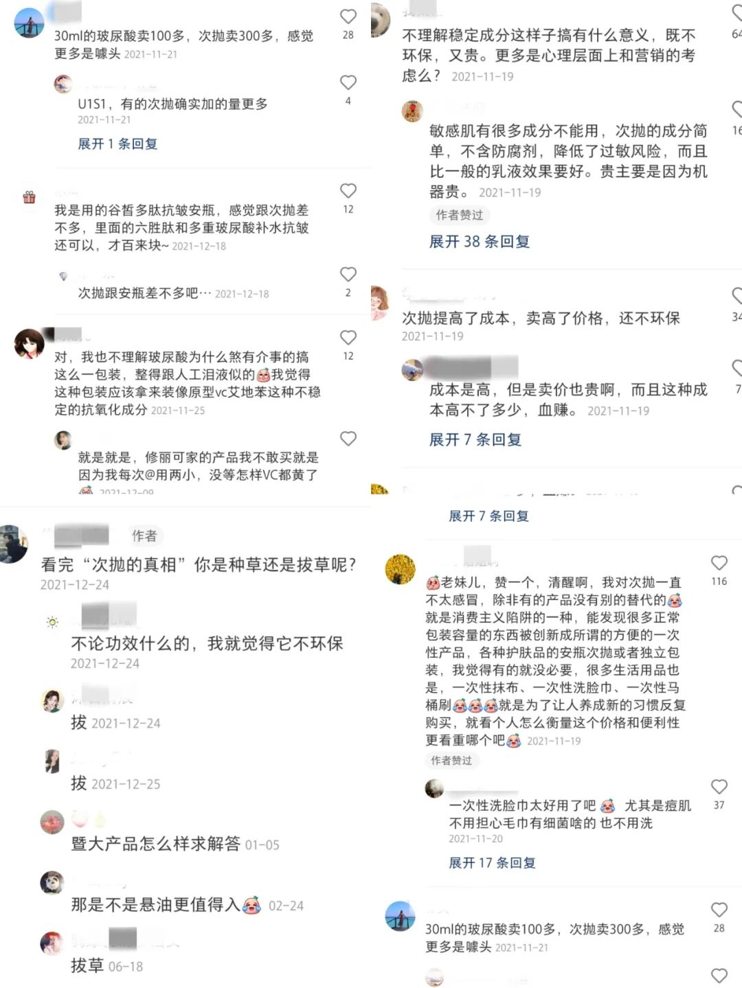 根据小红书中相关次抛产品消费者的反馈,目前一些产品还存在“概念性添加”、“剂量不准确,一次用不完又很难保存”、“包装鸡肋难用”等问题,这无疑给消费者心中种下了“营销大于实际用途”的种子,除了使产品无效内卷再内卷,并没有任何好处。