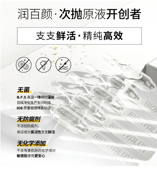 二、成分方面。BFS工艺可达到传统剂型无法实现的无防腐剂、无助溶剂等特殊要求。同时使一些VC、蓝铜肽等不稳定成分保持活性。