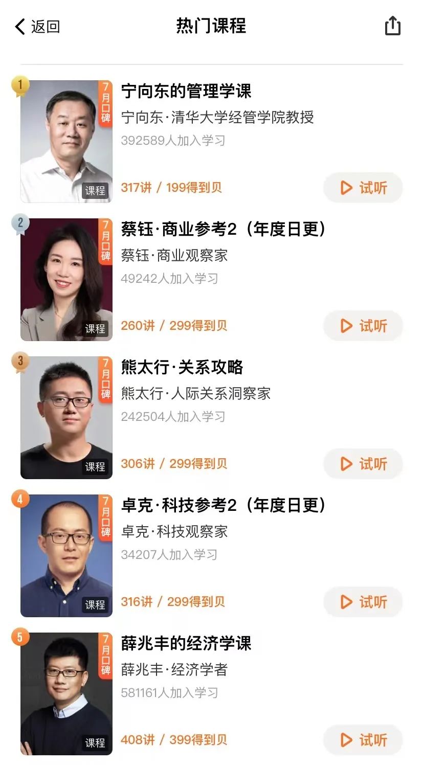 从具体的授课内容来看,思维造物的线上课程以成功学、职场学以及科普教学为主,属于非刚性课程。目前,“得到”APP上Top 3的课程是宁向东的管理学课、蔡钰的商业参考以及熊太行的关系攻略。这些课程看似“高大上”,实用性却不强,内容干货独创性有限,个人经验也没可复制性。