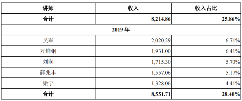 过去几年,“得到”平台的头部讲师展现出惊人的吸金能力。2019年至2021年,头部讲师吴军的贡献收入分别为2020.29万元、1635.67万元以及2144.65万元,贡献前五的讲师总收入分别为8551.71万元,8214.86万元以及7759.15万元,占课程收入的比例分别为28.40%、25.86%和19.51%,而讲师的分成比例一般为销售额净收的50%。