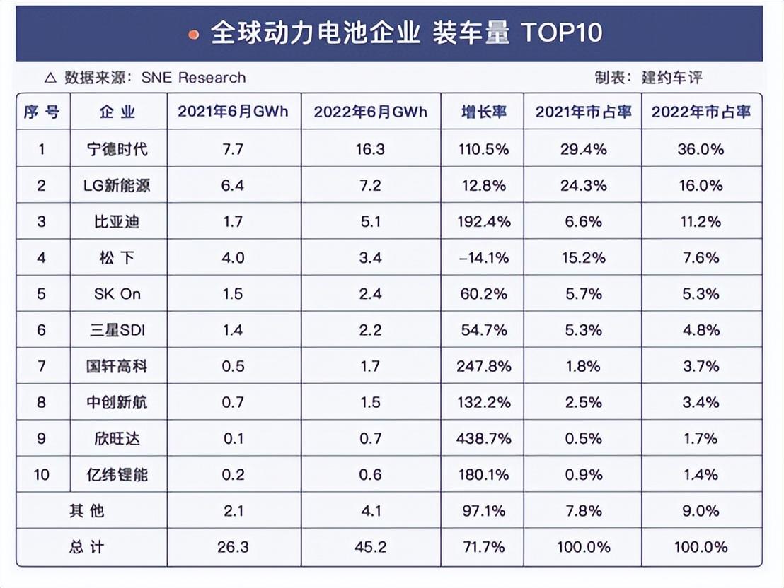 从动图中不难发现,比亚迪也是风头正劲,装机量和市占率增长迅猛,今年上半年的装机量达到 23.78GWh,市场占比为21.59%。这得益于比亚迪新能源汽车的热销:2022年上半年,比亚迪以64.7万辆的成绩超越特斯拉,成为全球销量最高的新能源汽车品牌。