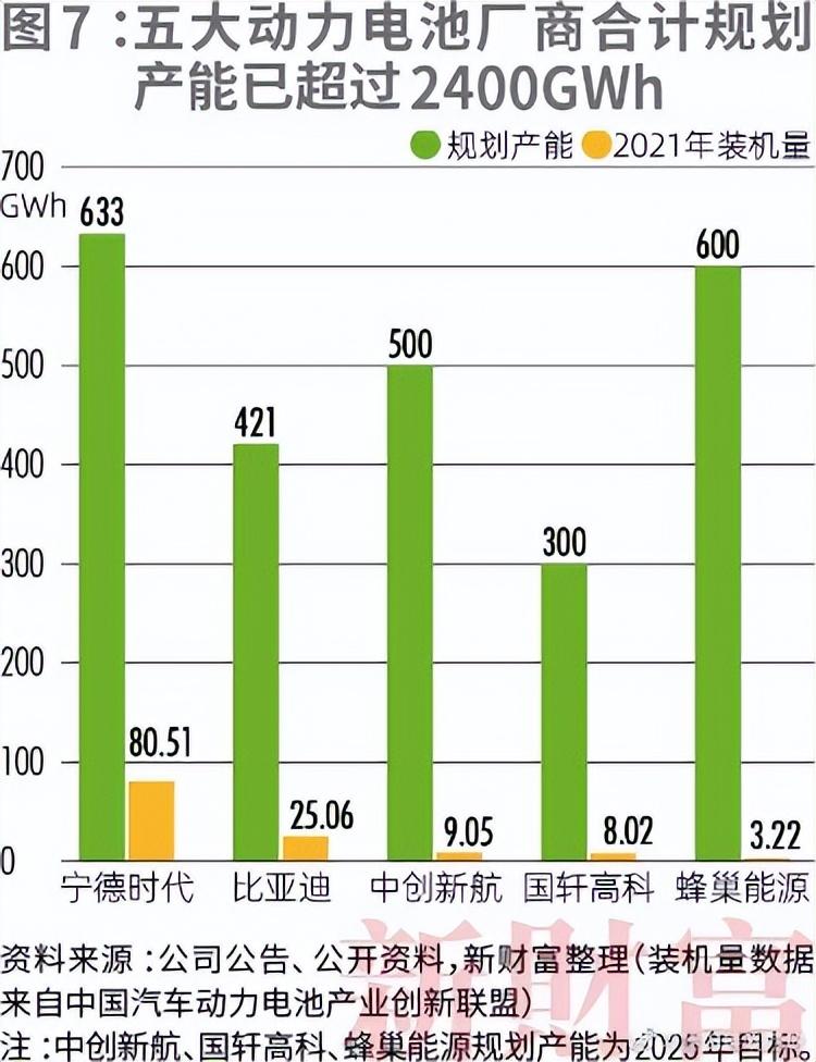 为了满足日益增长的市场需求,今年上半年,以比亚迪、欣旺达、中创新航等为代表的锂电池企业相继公布了多个新投建项目。国内五大电池厂商若能够顺利筹资,到2025年将达成超过2450GWh的产能,是目前装机量(125GWh)的近20倍,也是2021年中国锂电市场规模(324GWh)的8倍。