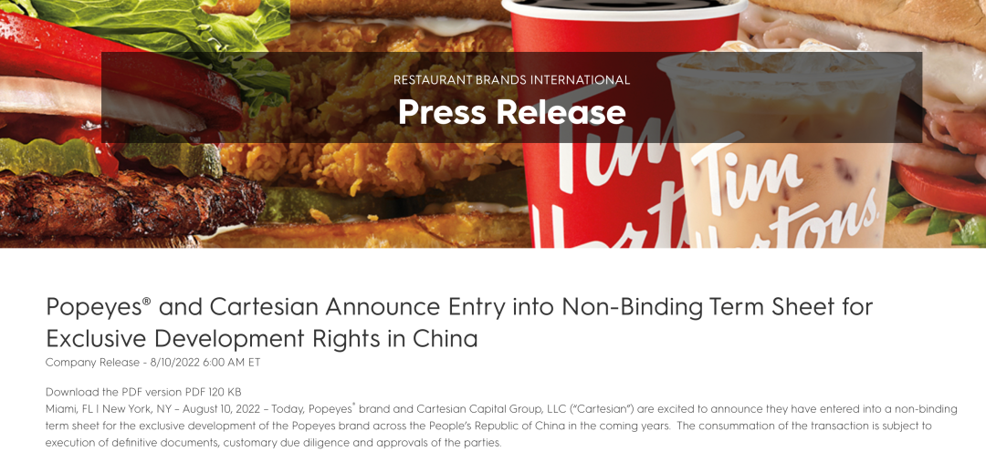 刚刚,炸鸡连锁Popeyes母公司Restaurant Brands International(下称:RBI)宣布,其已与笛卡尔资本签订一份关于未来几年在中国独家发展Popeyes品牌(中文名:博派斯)的不具约束力条款清单。交易完成仍要取决于最终文件的执行、惯常尽职调查和各方批准。