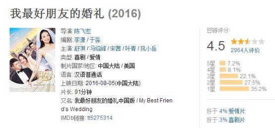 平心而论,美版《我最好朋友的婚礼》并不能算得上一部非常经典的爱情片,但这部电影轻松有趣,剧中真挚的感情也令人动容。然而,当这部电影被翻拍成中国版之后,轻松好笑却变成了尴尬和浮夸。在豆瓣上,原版电影的评分达到了7.7分,翻拍版却只有4.5分。