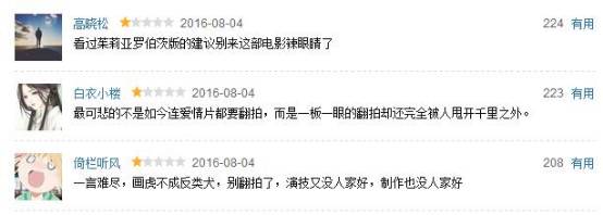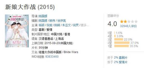 2015年上映的《新娘大作战》,同样翻拍自好莱坞同名爱情喜剧,由倪妮和杨颖主演。这部电影的原版本身就是一部平庸之作,有网友称其为“安妮·海瑟薇最烂的电影”。而翻拍版上映以后,更是遭遇了网友的疯狂吐槽。有网友总结说:“翻拍烂片,只会得到更烂的烂片。”有网友怒评:“烂的惊天动地。”甚至有网友说,看了电影,顿时讨厌婚礼了……