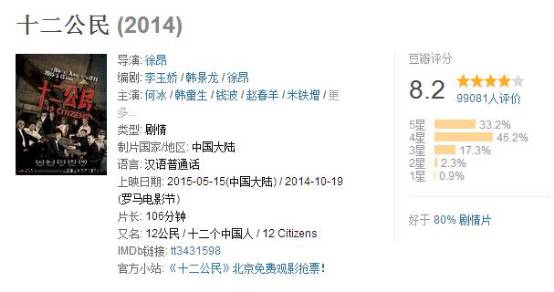 在众多翻拍“烂片”中,也有一些好作品。《十二公民》就是其中一部。《十二公民》翻拍自美国电影《十二怒汉》,于2014年上映,虽然票房仅有约1396万,却收获了不错的口碑。在一向打分严苛的豆瓣上,这部电影的评分为8.2分,好于80%剧情片。