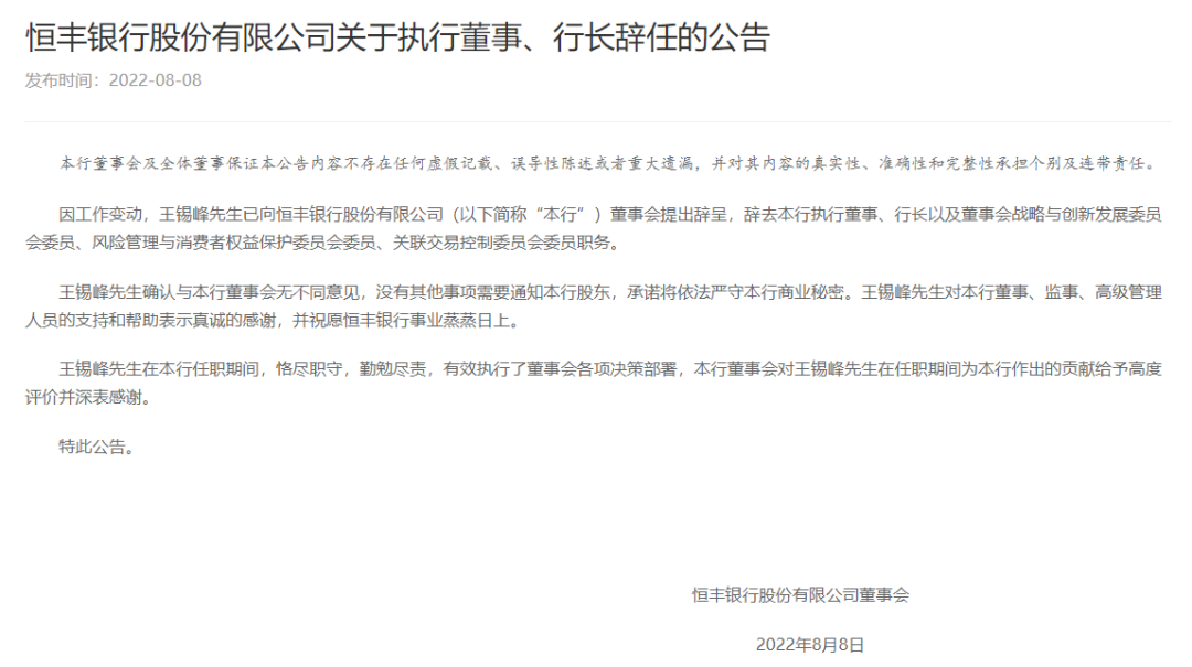 8月8日,因工作变动,恒丰银行行长王锡峰辞去了该行执行董事、行长等职务。同时,恒丰银行对其在任期间作出的贡献给予高度评价,并表示感谢。