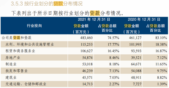 此外,恒丰银行部分贷款流入房企,且金额有所增加。年报显示,2021年恒丰银行公司类贷款和垫款占比较高,达74.57%。从行业投向来看,恒丰银行公司类贷款主要分布于水利、环境和公共设施管理业,占贷款总额的17.77%;其次为租赁和商务服务业,占比16.45%;房地产业位列第三,其贷款占比从2020年的7.12%增至2021年的8.46%。