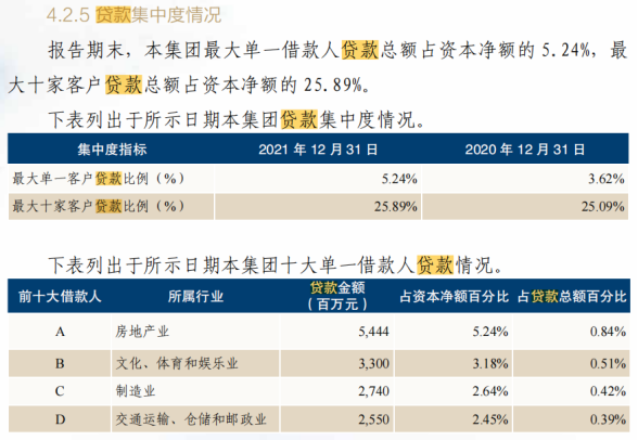 从贷款集中度情况来看,恒丰银行年内最大单一借款人贷款总额占资本净额的5.24%;前十大借款人中,第一大借款人来自房地产业,贷款金额54.44亿元,占资本净额的比例同样为5.24%。