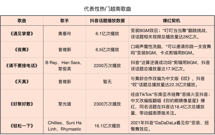 同时,因当下抖音所流行的变装、卡点等需要,越南电子音乐也开始作为短视频BGM爆红,占据了魔性神曲BGM的半壁江山,且在抖音的播放量几乎首首破亿。