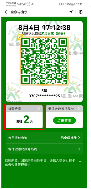 山东省始终坚持以人民为中心的发展思想,站在全国疫情防控一盘棋的高度上,充分认识到核酸检测结果是促进人员在全国范围内便利流动的“关键小事”,是进一步科学精准做好疫情防控的重要手段,立即研究部署,在山东健康码实现了跨省核酸检测结果展示和互认。