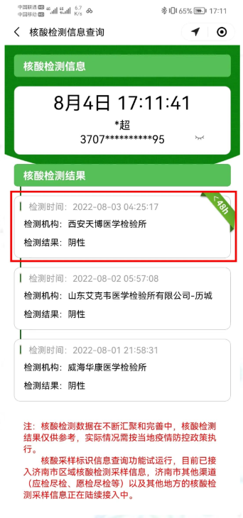 需要提醒居民的是,居民在其他省市的核酸检测信息,是山东健康码通过国家政务服务平台提供的全国核酸检测结果查询服务获得。因此,如无法顺利查询到外省市核酸检测结果,请您及时与外省市核酸检测机构联系,督促其尽快将检测结果上传至国家政务服务平台。