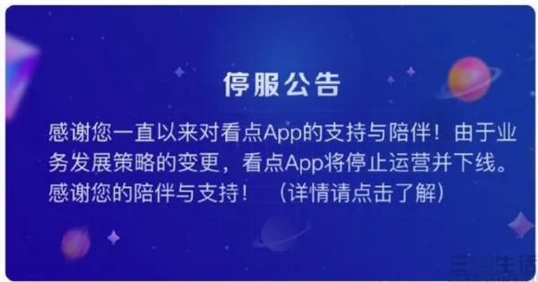腾讯看点App发布停服公告,宣布8月15日23时59分,服务器将关闭并正式停止运营,届时将无法登录看点App。腾讯官方表示,看点用户可通过手机QQ的小世界功能继续享受相关服务。此前,腾讯看点快报App已于今年7月18日停止运营。