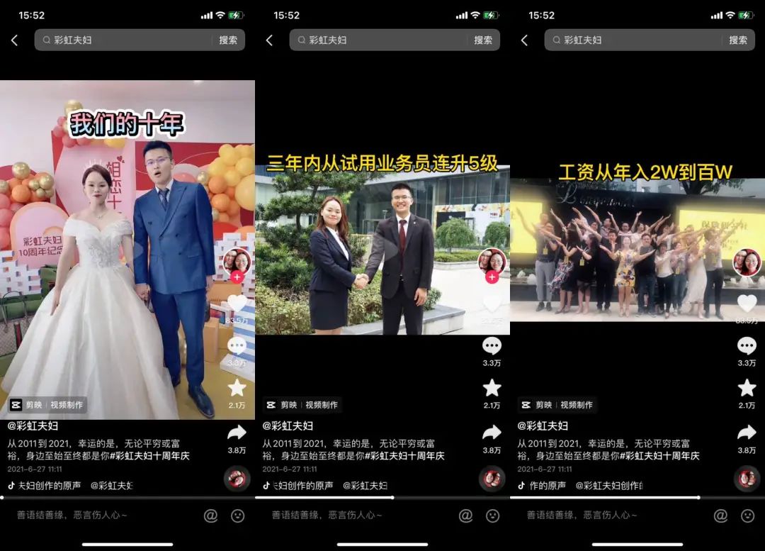 转折点发生在2020年3月。他们发布了两人过往十年的奋斗历程,毕业后两人进入门槛较低的保险行业,从没有客户的业务员升职为高级经理,有车有房有了孩子,每月结余能补贴父母,相互扶持在城市扎根。