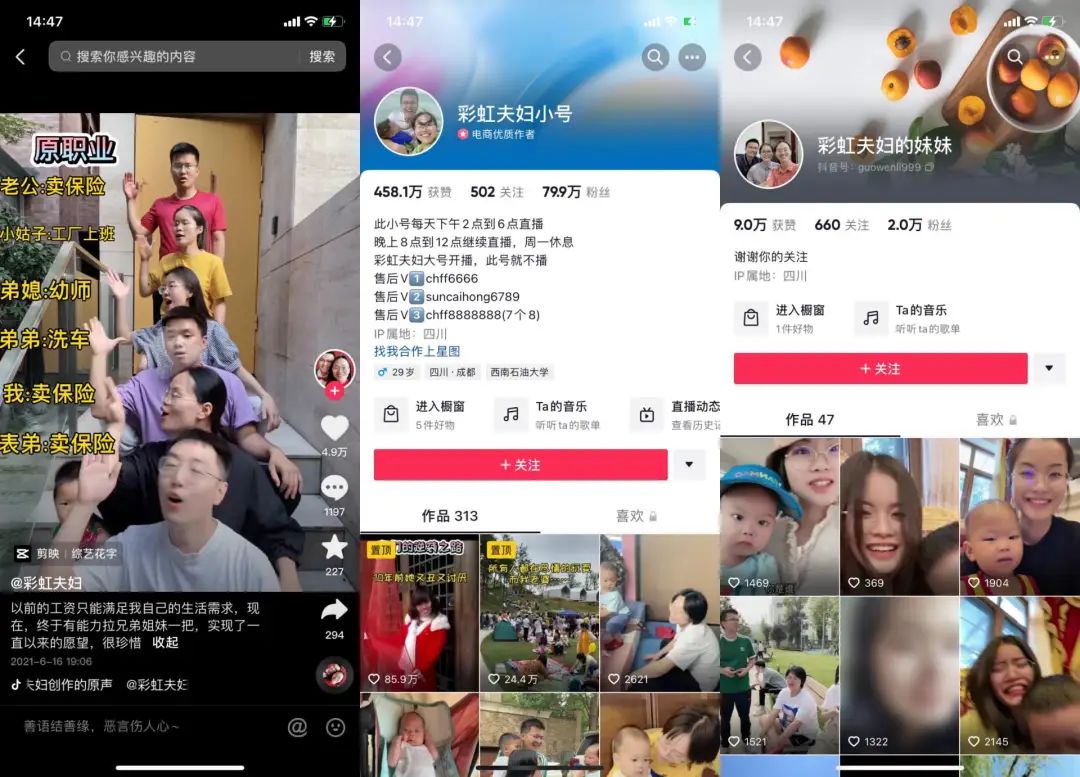 时不时让家人在大号上出镜“混脸熟”,另一方面在日常视频中 cue 到 @彩虹夫妇小号 ,为小号引流。大约在 2020 年 11 月,家人在小号上直播试水。似乎想将他们都培养成 KOL,从“夫妻两人”延伸到“家族”。