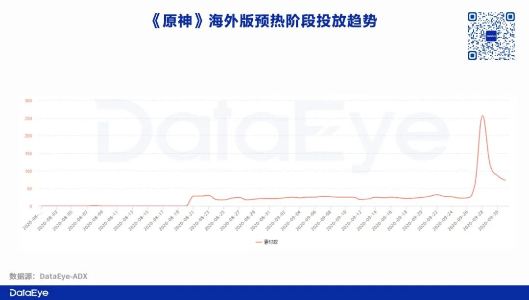 《原神》在预热阶段整体投放量较低,并且相对平缓,没有较大的投放波动。根据DataEye-ADX海外版数据,《原神》上线前30天日均投放素材数未超过30条,直到上线后才提升投放量。