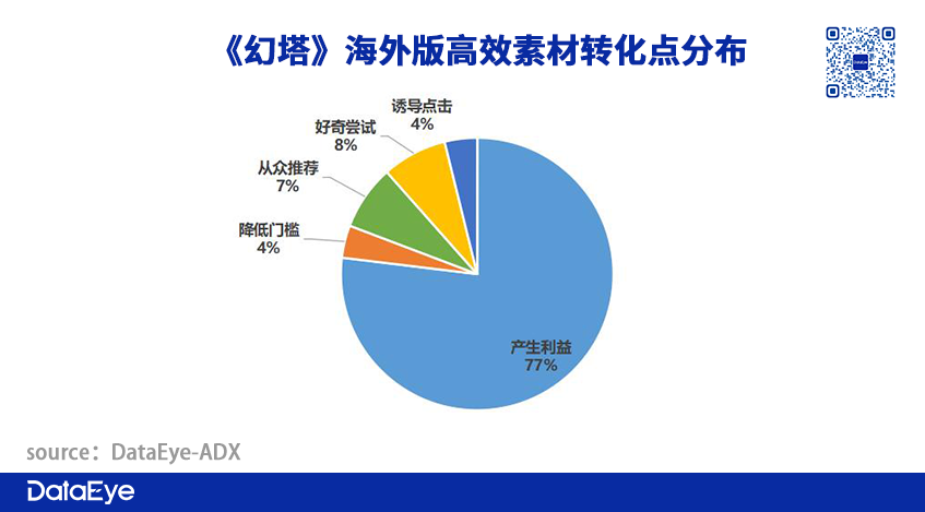 《幻塔》项目组主要通过“产生利益”这一原则作为转化,占比超过75%。“产生利益”主要指项目组通过广告素材的高品质内容,包括人物的精致展现、流畅的打斗画面、游戏画面的高品质等等,暗示游戏能提供优质的游戏体验和相对出色的游戏沉浸感。