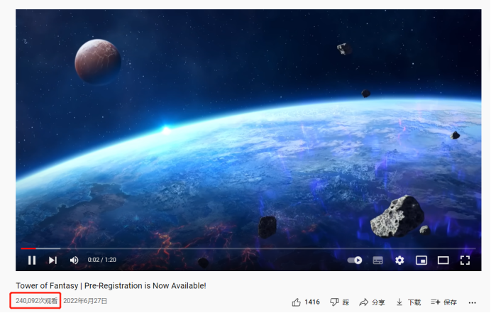 6月底,《幻塔》发行商Level Infinite在官方YouTube频道上发布了关于产品相关PV动画,正式宣布《幻塔》产品的上线时间,该PV目前取得超过24W次播放量;而今年以来,《幻塔》发行商Level Infinite一共发布了3条相关PV宣传片。